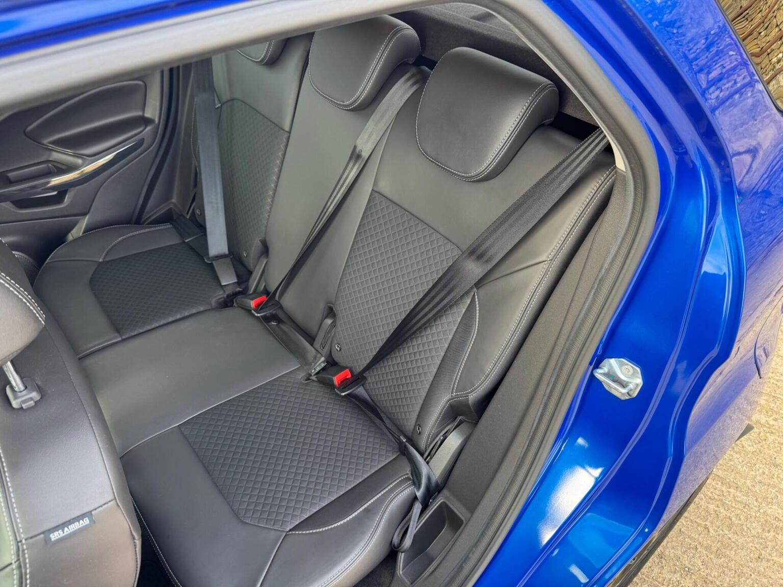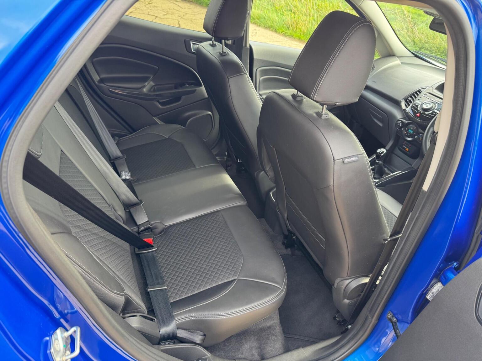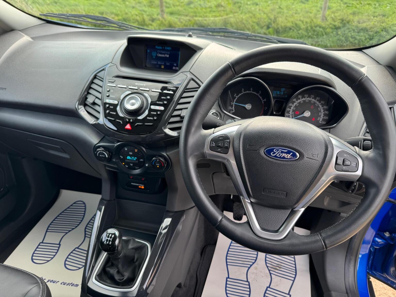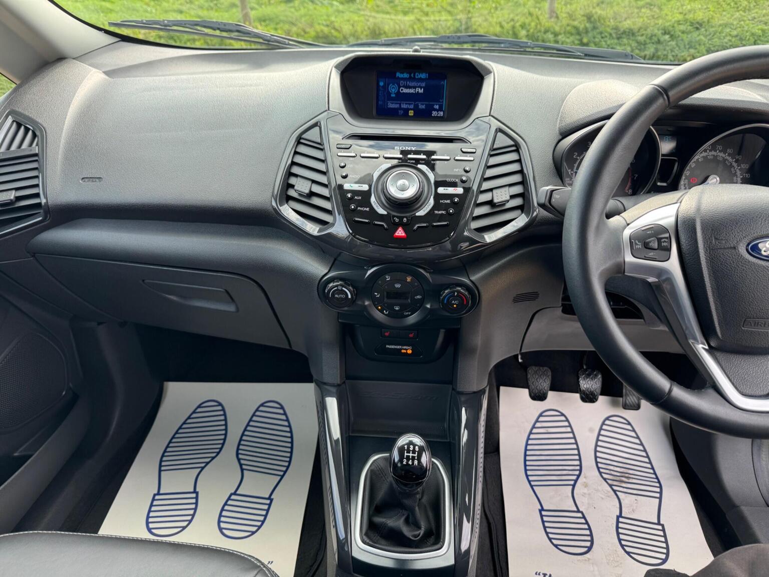 17in Alloy Wheels - 7x2 Spoke Black, Air Conditioning - Electronic Automatic Temperature Control - EATC, Airbags - Driver and Front Passenger, Airbags - Drivers Knee, Airbags - Front Passenger De-Activation Switch, Airbags - Front Side, Airbags - Front and Rear Side Curtain, Anti-Lock Braking System - ABS with Electronic Stability Control - ESC, Armrest - Drivers, Auto Dimming Rear View Mirror, Black Contrast Roof, Child Locks, Courtesy Lights - Front and Rear Centre with Theatre-style Dimming, Cruise Control, Door Mirrors - Black Housing - Electrically-operated with Integrated Side Indicator, EPAS - Electric Power Assisted Steering, Floor Mats - Carpet - Front and Rear, Ford Easy-Fuel Capless Refuelling System, Ford Keyfree System - Keyless Entry with Ford Power Starter Button, Front Bumper - Body Colour with Dark Valance, Front Fog Lights with Integrated Daytime Running Lights and Chrome Surrounds, Front Lower Grille - Chrome, Front Seat - Drivers Manual Height and Fore-Aft Adjustment, Front Seat - Drivers Manual Lumbar Support Adjustment, Front Seat - Passengers Fore-Aft Adjustment, Front Seat - Under Passenger Seat Stowage, Front Seats - 2-Way Head Restraint Up-Down, Front Seats - Seat-Back Map Pockets, Front Suspension - Independent with MacPherson Struts and Anti-Roll Bar, Front Upper Grille - Chrome, Front and Rear Power Points - 12V, Gear Shift Indicator, Gearshift Knob - Leather-trimmed with Black Insert and Aluminium-finish Ring, Headlights - Automatic - Halogen with LED Signature Lights, Hill Start Assist, IPS - Intelligent Protection System, Interior Door Lever - Chrome Finish, Locking Wheel Nuts, Package Tray, Rake Adjustable Rear Seat, Rear Bumper - Body Colour with Dark Valance, Rear Privacy Glass, Rear Seat - 60-40 Split Folding Seat Back and Cushion with Multi-Step Recline Function, Rear Suspension - Semi-Independent Twist Beam with Twin Gas and Oil-Filled Shock Absorbers, Scuff Plates - Silver, Seats - ISOFIX Mounting Provision for Child Seats - Outer Seats Only, Silver Lower-Bumper Lip - Front and Rear, Sony Radio-CD with DAB, Sports Suspension, Steering Column - Rake and Reach Adjustment, Steering Wheel - 3-spoke - Leather-trimmed - Remote Audio Controls, Thatcham Alarm, Threshold Plates - Front - Stainless Steel with EcoSport Logo, Tie-Down Hooks, Trip Computer, Tyre Pressure Monitoring System, Windows - Front Power with One-Touch Opening-Closing on Drivers Side, Windows - Rear Power, Wipers - Front - Automatic with Rain Sensor, Wipers - Rear Wash-Wipe - Intermittent