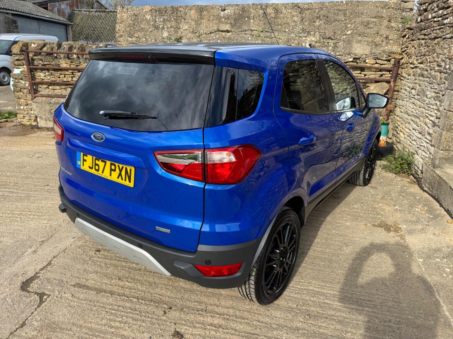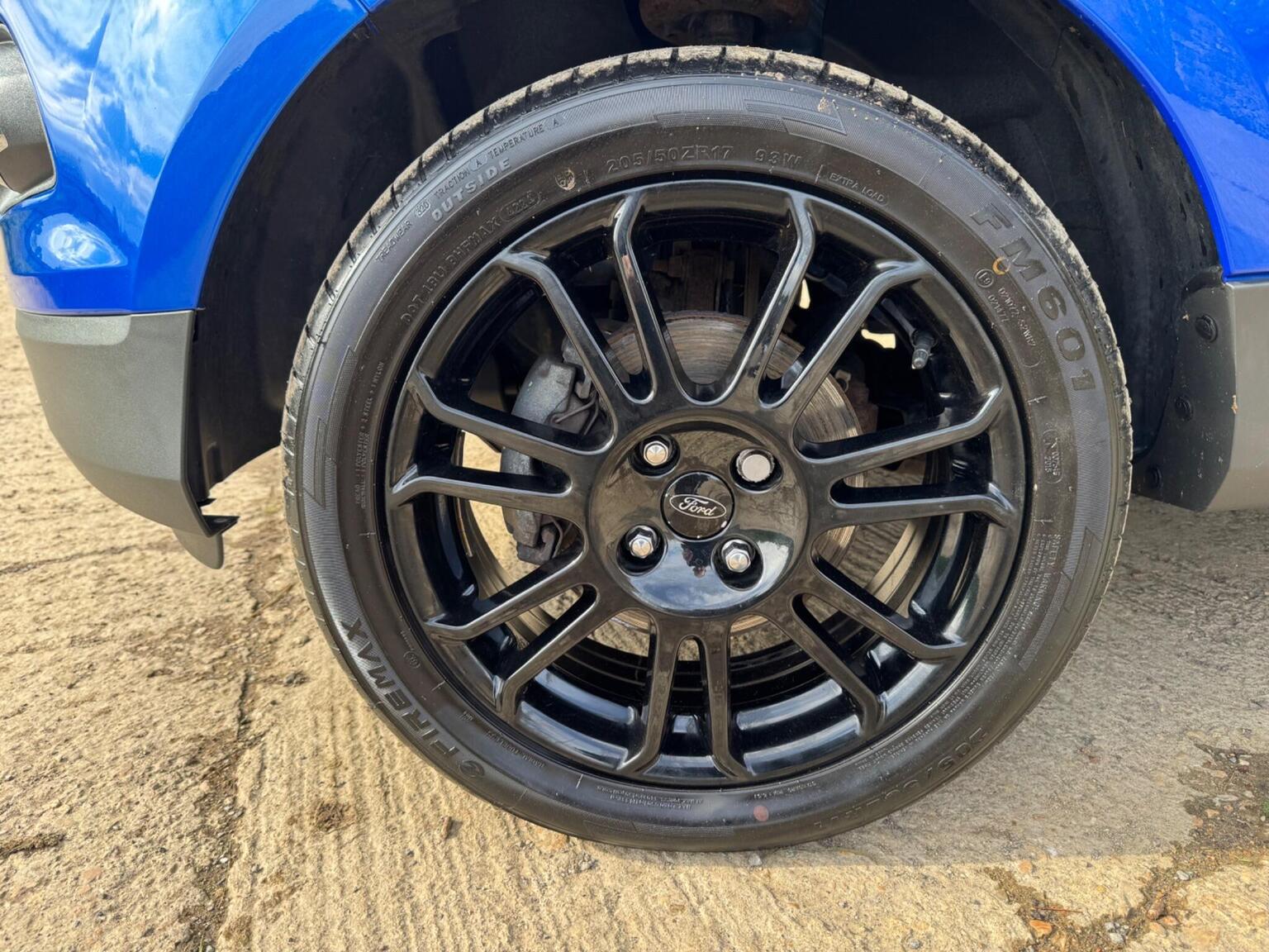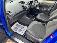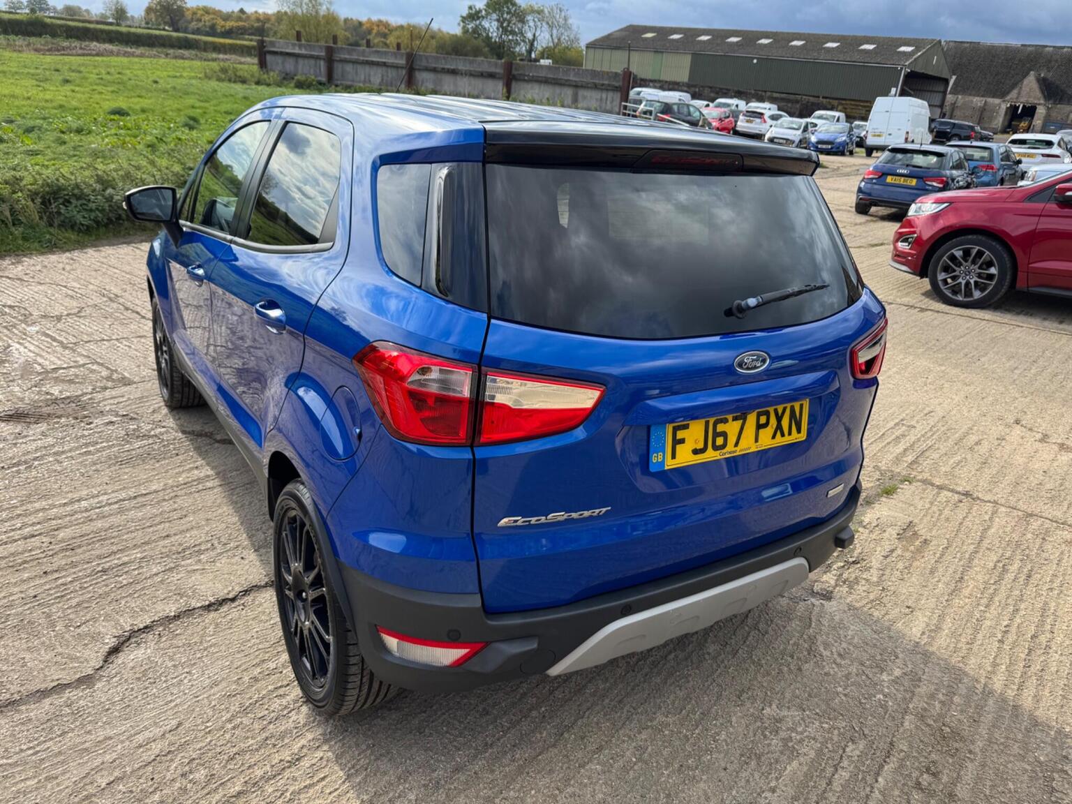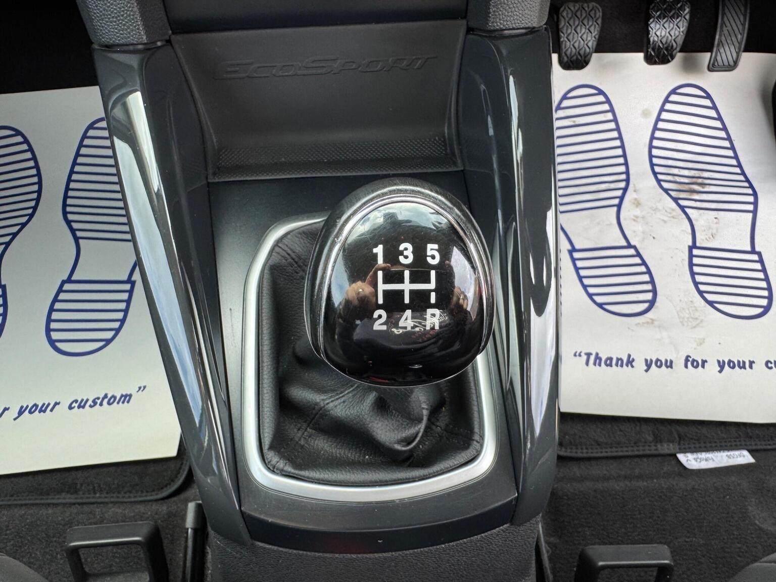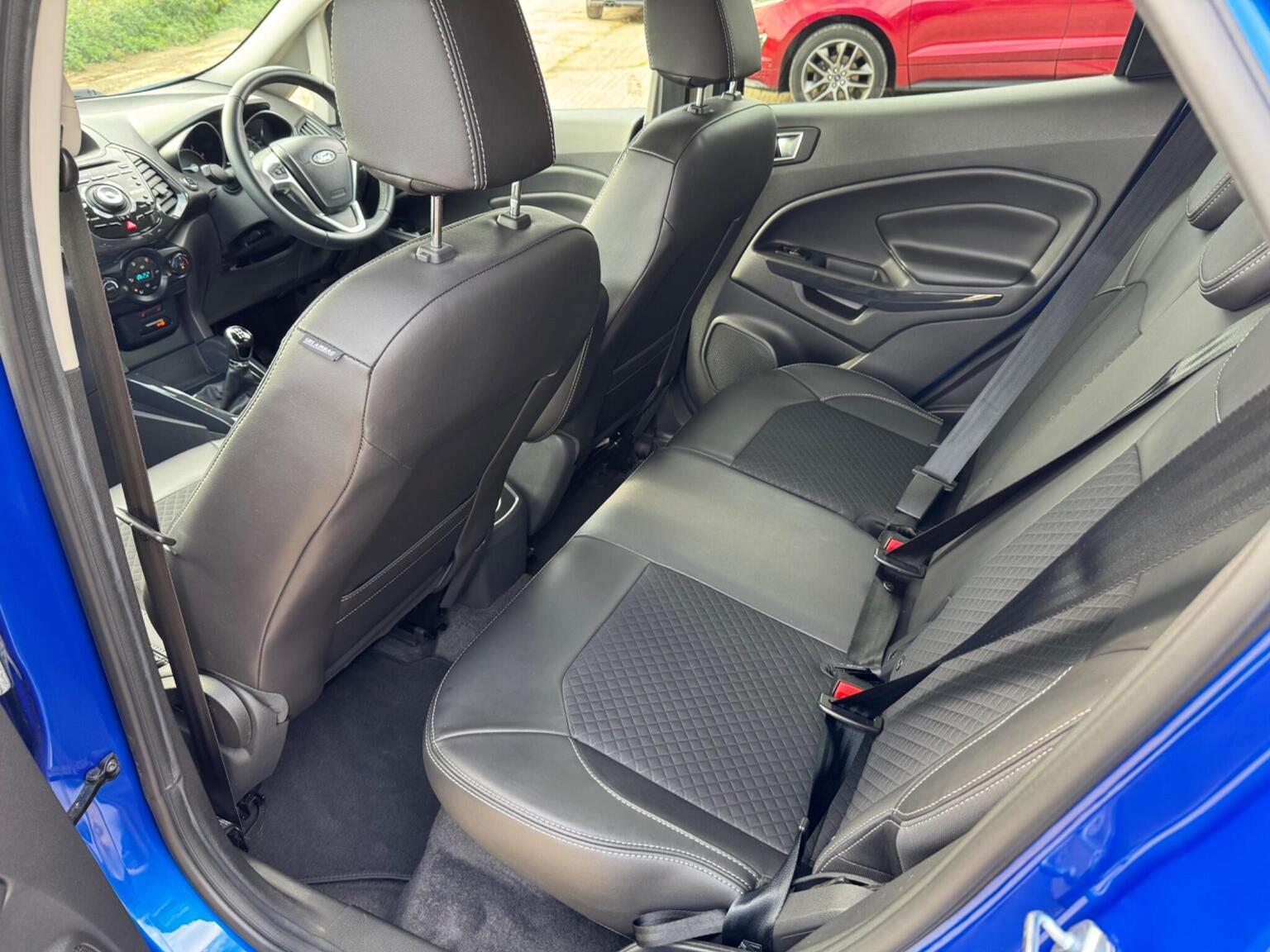 17in Alloy Wheels - 7x2 Spoke Black, Air Conditioning - Electronic Automatic Temperature Control - EATC, Airbags - Driver and Front Passenger, Airbags - Drivers Knee, Airbags - Front Passenger De-Activation Switch, Airbags - Front Side, Airbags - Front and Rear Side Curtain, Anti-Lock Braking System - ABS with Electronic Stability Control - ESC, Armrest - Drivers, Auto Dimming Rear View Mirror, Black Contrast Roof, Child Locks, Courtesy Lights - Front and Rear Centre with Theatre-style Dimming, Cruise Control, Door Mirrors - Black Housing - Electrically-operated with Integrated Side Indicator, EPAS - Electric Power Assisted Steering, Floor Mats - Carpet - Front and Rear, Ford Easy-Fuel Capless Refuelling System, Ford Keyfree System - Keyless Entry with Ford Power Starter Button, Front Bumper - Body Colour with Dark Valance, Front Fog Lights with Integrated Daytime Running Lights and Chrome Surrounds, Front Lower Grille - Chrome, Front Seat - Drivers Manual Height and Fore-Aft Adjustment, Front Seat - Drivers Manual Lumbar Support Adjustment, Front Seat - Passengers Fore-Aft Adjustment, Front Seat - Under Passenger Seat Stowage, Front Seats - 2-Way Head Restraint Up-Down, Front Seats - Seat-Back Map Pockets, Front Suspension - Independent with MacPherson Struts and Anti-Roll Bar, Front Upper Grille - Chrome, Front and Rear Power Points - 12V, Gear Shift Indicator, Gearshift Knob - Leather-trimmed with Black Insert and Aluminium-finish Ring, Headlights - Automatic - Halogen with LED Signature Lights, Hill Start Assist, IPS - Intelligent Protection System, Interior Door Lever - Chrome Finish, Locking Wheel Nuts, Package Tray, Rake Adjustable Rear Seat, Rear Bumper - Body Colour with Dark Valance, Rear Privacy Glass, Rear Seat - 60-40 Split Folding Seat Back and Cushion with Multi-Step Recline Function, Rear Suspension - Semi-Independent Twist Beam with Twin Gas and Oil-Filled Shock Absorbers, Scuff Plates - Silver, Seats - ISOFIX Mounting Provision for Child Seats - Outer Seats Only, Silver Lower-Bumper Lip - Front and Rear, Sony Radio-CD with DAB, Sports Suspension, Steering Column - Rake and Reach Adjustment, Steering Wheel - 3-spoke - Leather-trimmed - Remote Audio Controls, Thatcham Alarm, Threshold Plates - Front - Stainless Steel with EcoSport Logo, Tie-Down Hooks, Trip Computer, Tyre Pressure Monitoring System, Windows - Front Power with One-Touch Opening-Closing on Drivers Side, Windows - Rear Power, Wipers - Front - Automatic with Rain Sensor, Wipers - Rear Wash-Wipe - Intermittent