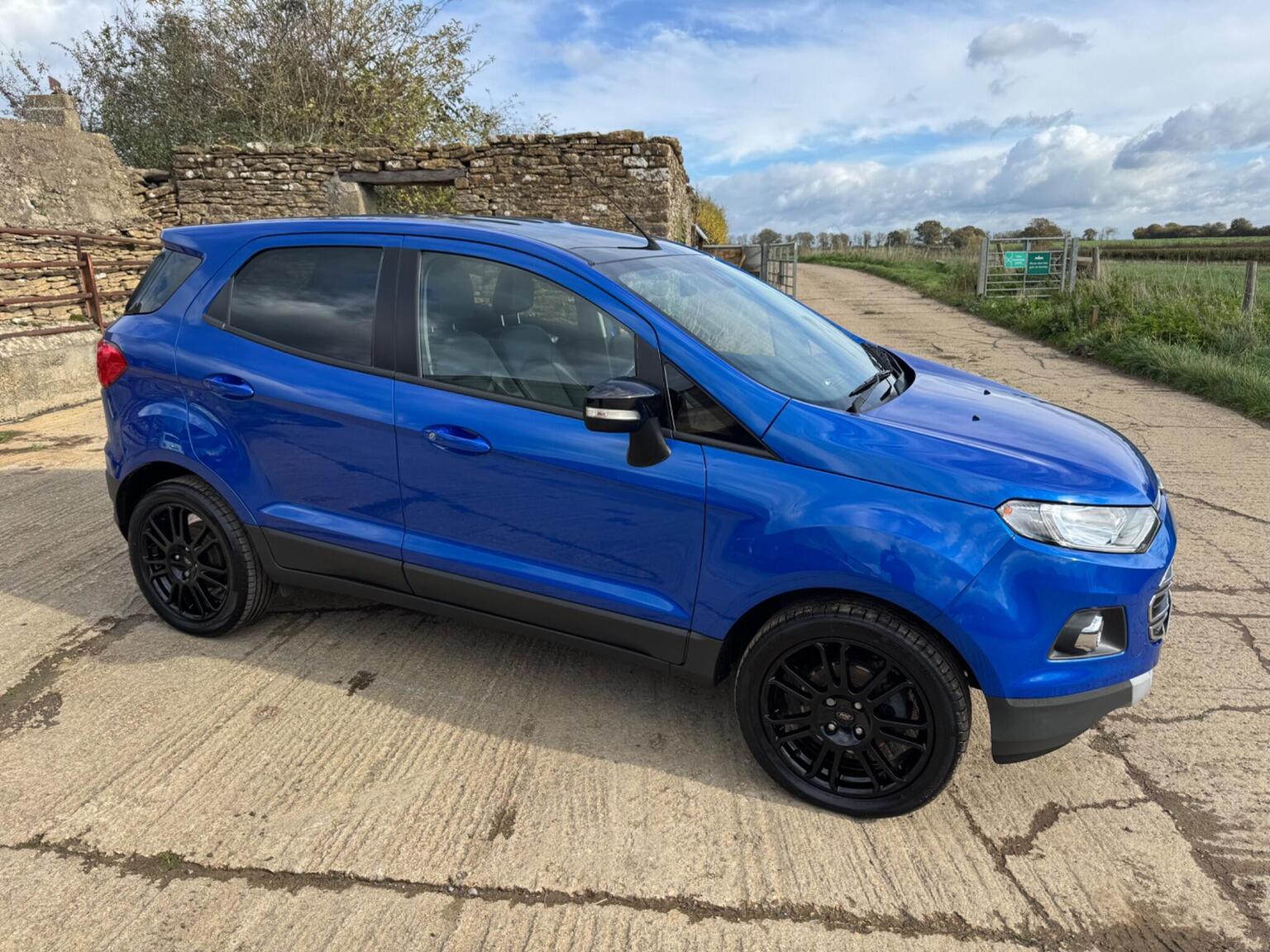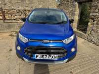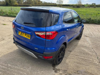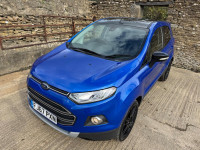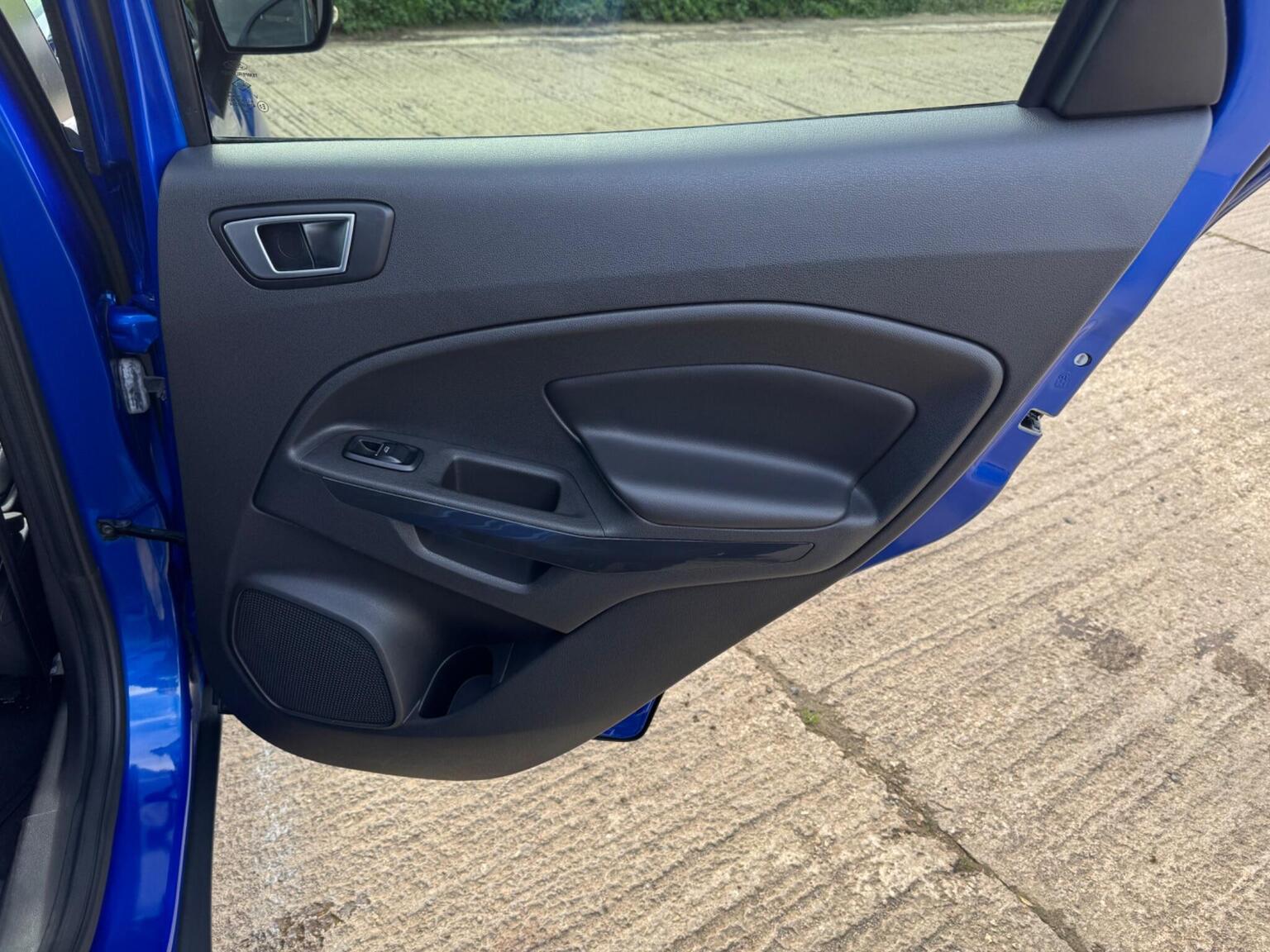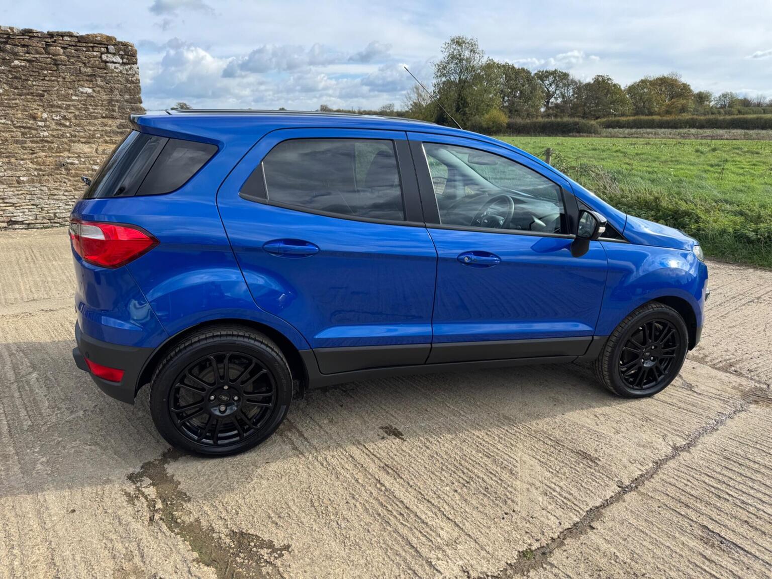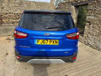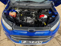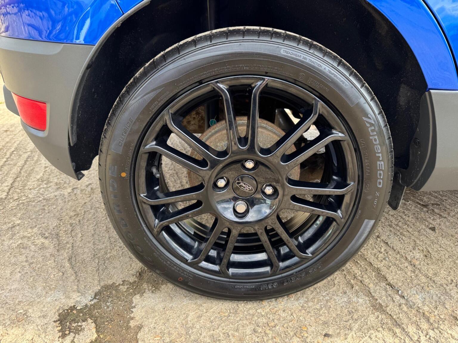 17in Alloy Wheels - 7x2 Spoke Black, Air Conditioning - Electronic Automatic Temperature Control - EATC, Airbags - Driver and Front Passenger, Airbags - Drivers Knee, Airbags - Front Passenger De-Activation Switch, Airbags - Front Side, Airbags - Front and Rear Side Curtain, Anti-Lock Braking System - ABS with Electronic Stability Control - ESC, Armrest - Drivers, Auto Dimming Rear View Mirror, Black Contrast Roof, Child Locks, Courtesy Lights - Front and Rear Centre with Theatre-style Dimming, Cruise Control, Door Mirrors - Black Housing - Electrically-operated with Integrated Side Indicator, EPAS - Electric Power Assisted Steering, Floor Mats - Carpet - Front and Rear, Ford Easy-Fuel Capless Refuelling System, Ford Keyfree System - Keyless Entry with Ford Power Starter Button, Front Bumper - Body Colour with Dark Valance, Front Fog Lights with Integrated Daytime Running Lights and Chrome Surrounds, Front Lower Grille - Chrome, Front Seat - Drivers Manual Height and Fore-Aft Adjustment, Front Seat - Drivers Manual Lumbar Support Adjustment, Front Seat - Passengers Fore-Aft Adjustment, Front Seat - Under Passenger Seat Stowage, Front Seats - 2-Way Head Restraint Up-Down, Front Seats - Seat-Back Map Pockets, Front Suspension - Independent with MacPherson Struts and Anti-Roll Bar, Front Upper Grille - Chrome, Front and Rear Power Points - 12V, Gear Shift Indicator, Gearshift Knob - Leather-trimmed with Black Insert and Aluminium-finish Ring, Headlights - Automatic - Halogen with LED Signature Lights, Hill Start Assist, IPS - Intelligent Protection System, Interior Door Lever - Chrome Finish, Locking Wheel Nuts, Package Tray, Rake Adjustable Rear Seat, Rear Bumper - Body Colour with Dark Valance, Rear Privacy Glass, Rear Seat - 60-40 Split Folding Seat Back and Cushion with Multi-Step Recline Function, Rear Suspension - Semi-Independent Twist Beam with Twin Gas and Oil-Filled Shock Absorbers, Scuff Plates - Silver, Seats - ISOFIX Mounting Provision for Child Seats - Outer Seats Only, Silver Lower-Bumper Lip - Front and Rear, Sony Radio-CD with DAB, Sports Suspension, Steering Column - Rake and Reach Adjustment, Steering Wheel - 3-spoke - Leather-trimmed - Remote Audio Controls, Thatcham Alarm, Threshold Plates - Front - Stainless Steel with EcoSport Logo, Tie-Down Hooks, Trip Computer, Tyre Pressure Monitoring System, Windows - Front Power with One-Touch Opening-Closing on Drivers Side, Windows - Rear Power, Wipers - Front - Automatic with Rain Sensor, Wipers - Rear Wash-Wipe - Intermittent