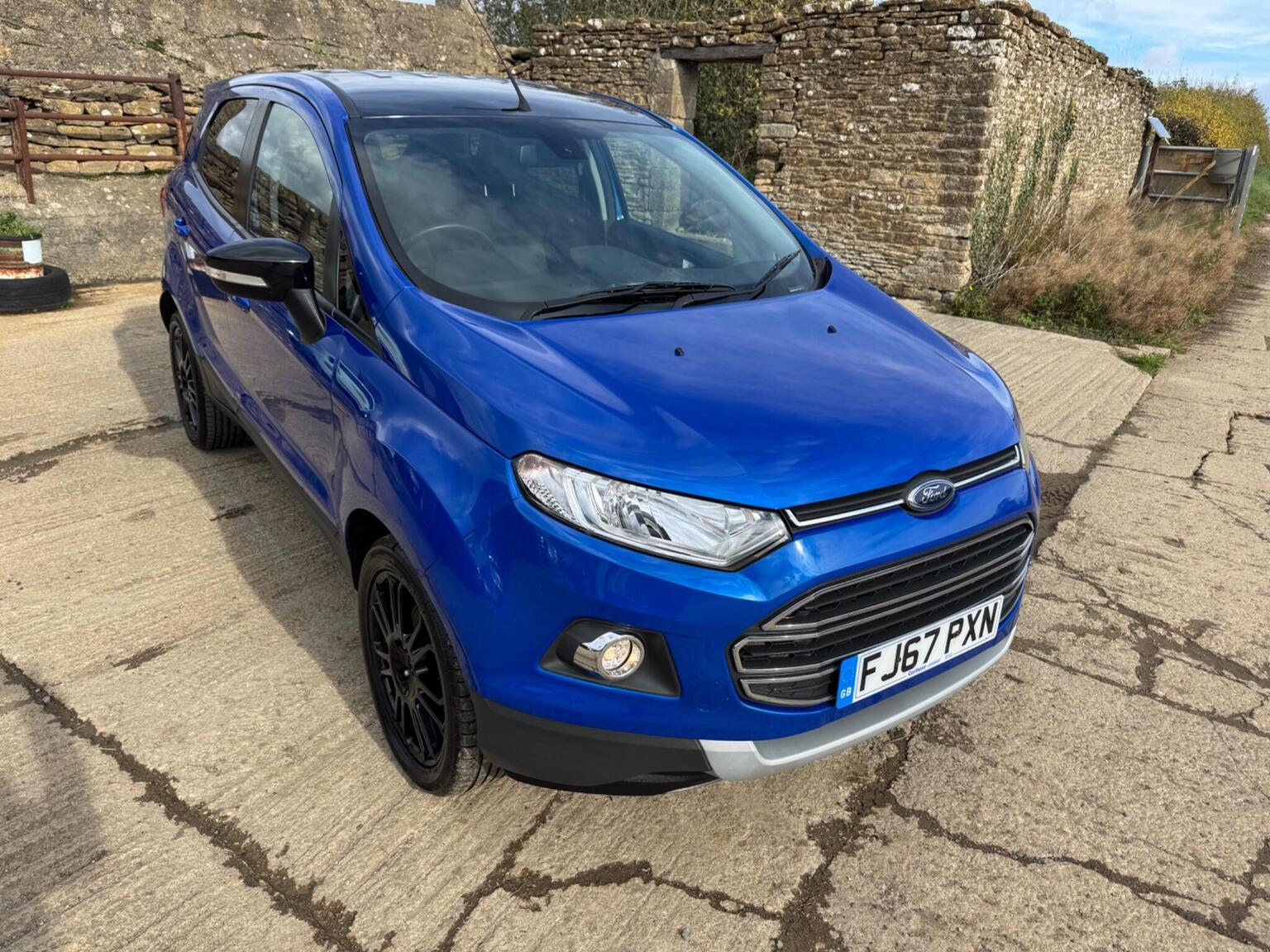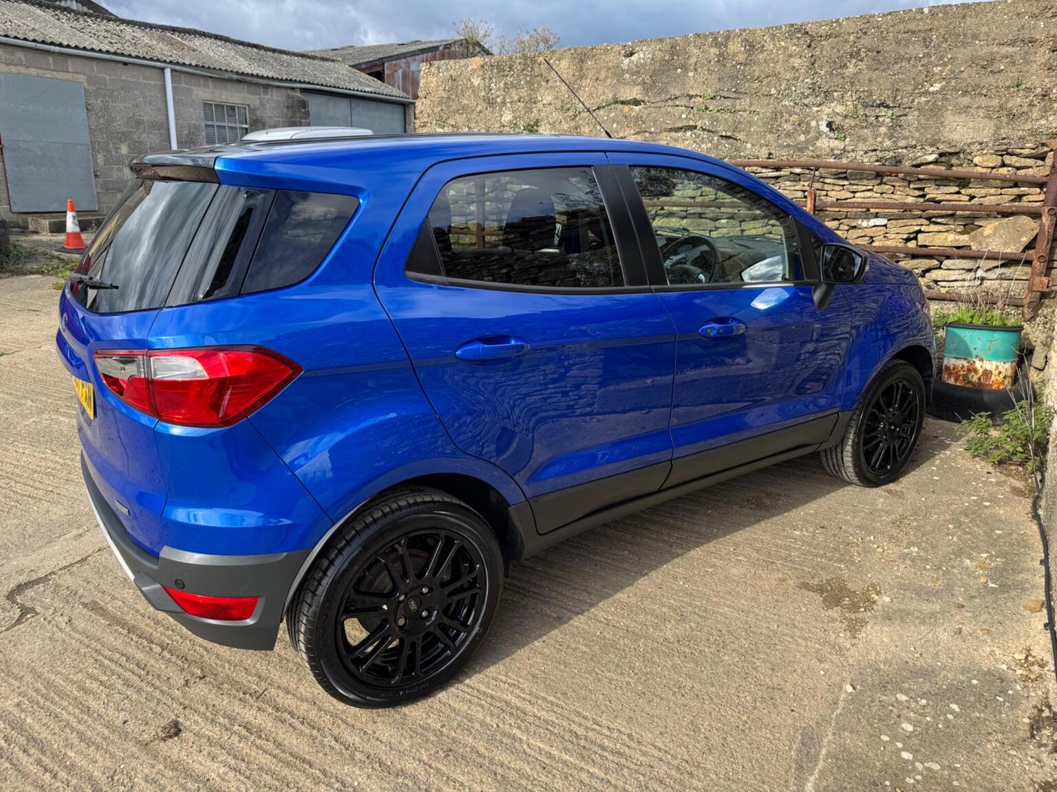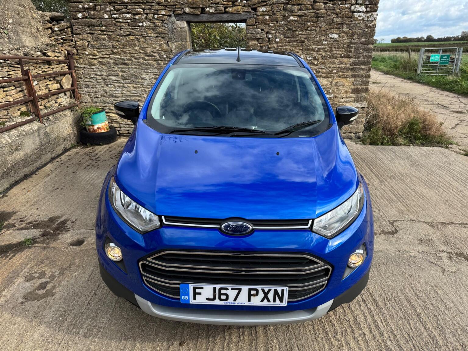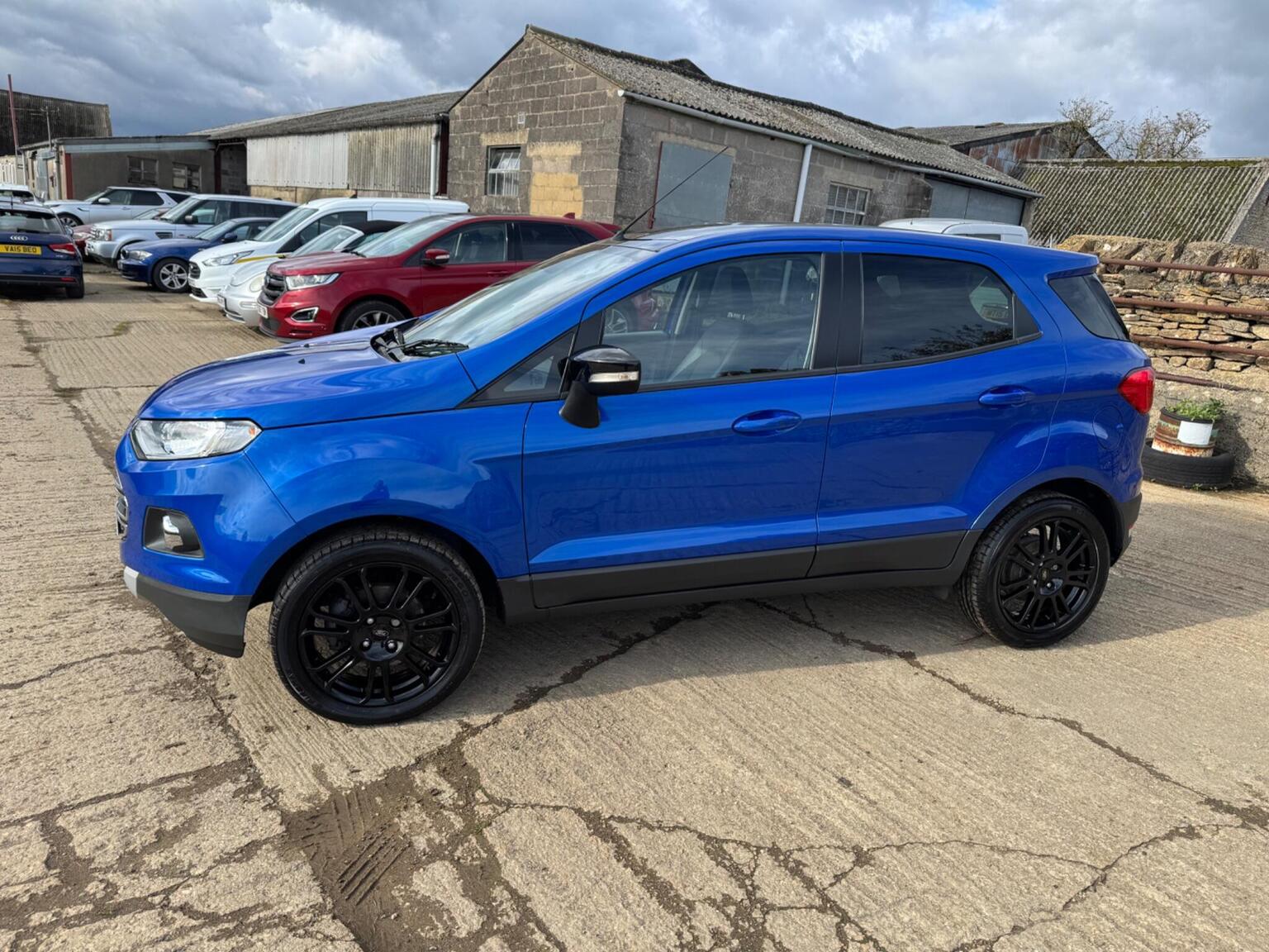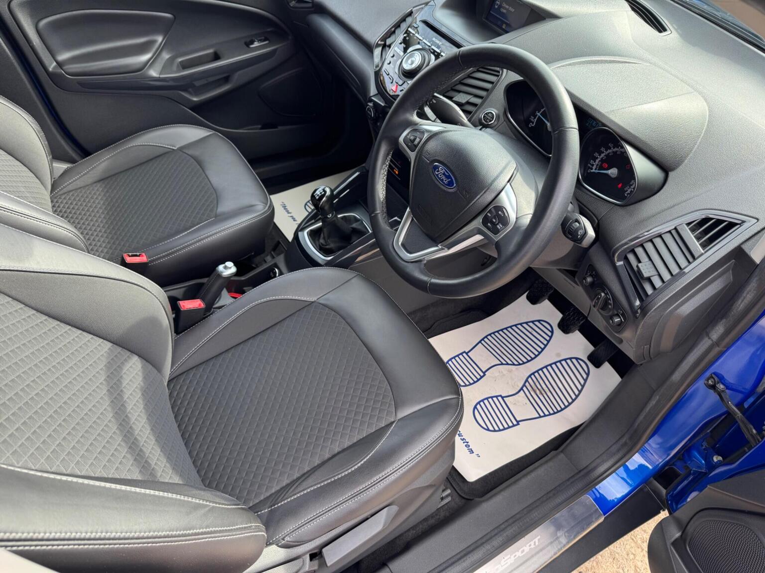 17in Alloy Wheels - 7x2 Spoke Black, Air Conditioning - Electronic Automatic Temperature Control - EATC, Airbags - Driver and Front Passenger, Airbags - Drivers Knee, Airbags - Front Passenger De-Activation Switch, Airbags - Front Side, Airbags - Front and Rear Side Curtain, Anti-Lock Braking System - ABS with Electronic Stability Control - ESC, Armrest - Drivers, Auto Dimming Rear View Mirror, Black Contrast Roof, Child Locks, Courtesy Lights - Front and Rear Centre with Theatre-style Dimming, Cruise Control, Door Mirrors - Black Housing - Electrically-operated with Integrated Side Indicator, EPAS - Electric Power Assisted Steering, Floor Mats - Carpet - Front and Rear, Ford Easy-Fuel Capless Refuelling System, Ford Keyfree System - Keyless Entry with Ford Power Starter Button, Front Bumper - Body Colour with Dark Valance, Front Fog Lights with Integrated Daytime Running Lights and Chrome Surrounds, Front Lower Grille - Chrome, Front Seat - Drivers Manual Height and Fore-Aft Adjustment, Front Seat - Drivers Manual Lumbar Support Adjustment, Front Seat - Passengers Fore-Aft Adjustment, Front Seat - Under Passenger Seat Stowage, Front Seats - 2-Way Head Restraint Up-Down, Front Seats - Seat-Back Map Pockets, Front Suspension - Independent with MacPherson Struts and Anti-Roll Bar, Front Upper Grille - Chrome, Front and Rear Power Points - 12V, Gear Shift Indicator, Gearshift Knob - Leather-trimmed with Black Insert and Aluminium-finish Ring, Headlights - Automatic - Halogen with LED Signature Lights, Hill Start Assist, IPS - Intelligent Protection System, Interior Door Lever - Chrome Finish, Locking Wheel Nuts, Package Tray, Rake Adjustable Rear Seat, Rear Bumper - Body Colour with Dark Valance, Rear Privacy Glass, Rear Seat - 60-40 Split Folding Seat Back and Cushion with Multi-Step Recline Function, Rear Suspension - Semi-Independent Twist Beam with Twin Gas and Oil-Filled Shock Absorbers, Scuff Plates - Silver, Seats - ISOFIX Mounting Provision for Child Seats - Outer Seats Only, Silver Lower-Bumper Lip - Front and Rear, Sony Radio-CD with DAB, Sports Suspension, Steering Column - Rake and Reach Adjustment, Steering Wheel - 3-spoke - Leather-trimmed - Remote Audio Controls, Thatcham Alarm, Threshold Plates - Front - Stainless Steel with EcoSport Logo, Tie-Down Hooks, Trip Computer, Tyre Pressure Monitoring System, Windows - Front Power with One-Touch Opening-Closing on Drivers Side, Windows - Rear Power, Wipers - Front - Automatic with Rain Sensor, Wipers - Rear Wash-Wipe - Intermittent