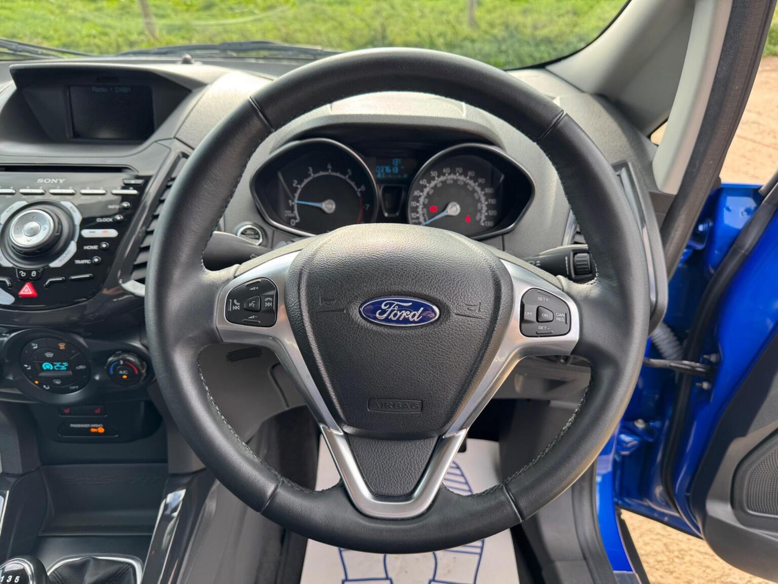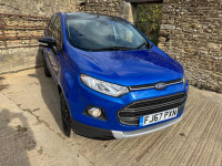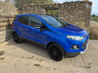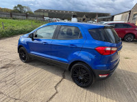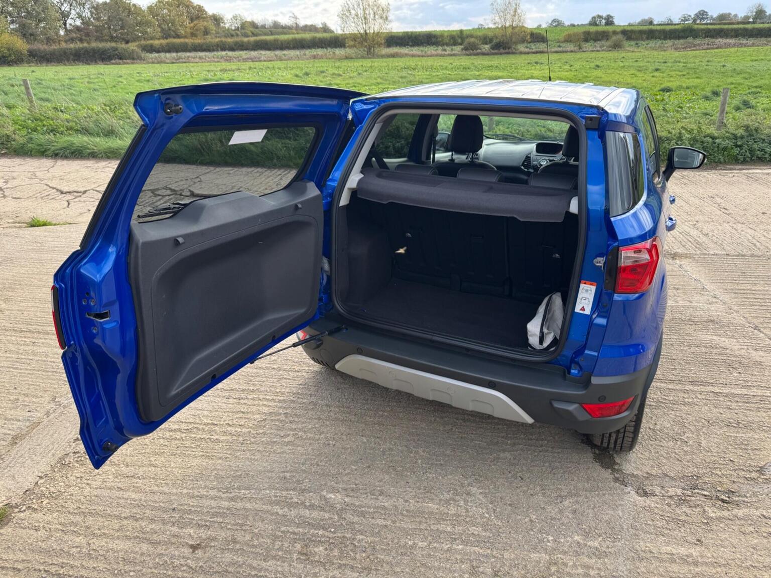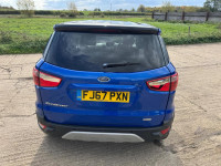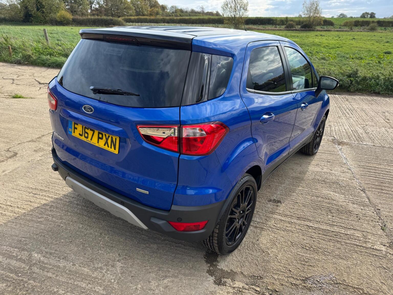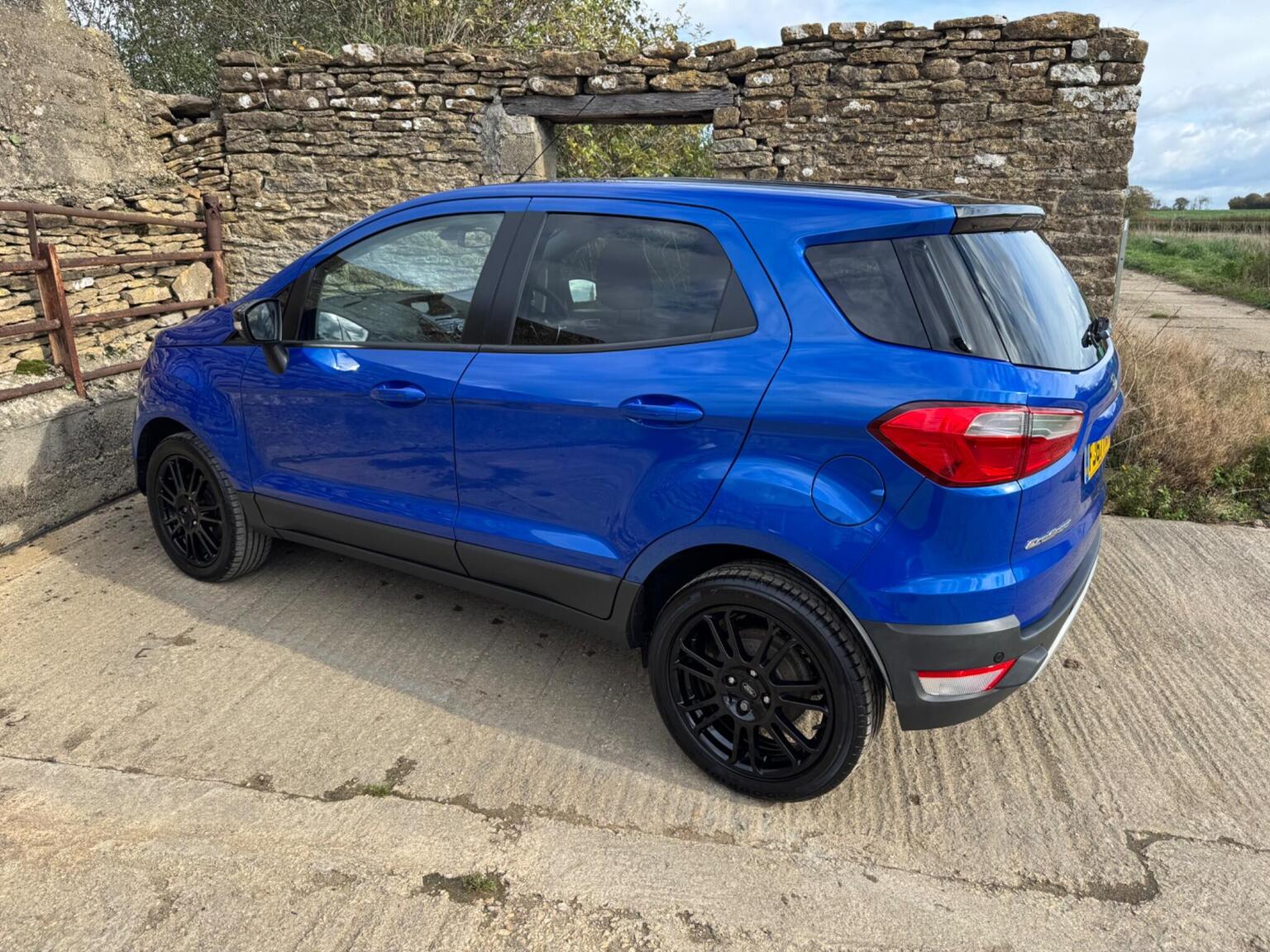 17in Alloy Wheels - 7x2 Spoke Black, Air Conditioning - Electronic Automatic Temperature Control - EATC, Airbags - Driver and Front Passenger, Airbags - Drivers Knee, Airbags - Front Passenger De-Activation Switch, Airbags - Front Side, Airbags - Front and Rear Side Curtain, Anti-Lock Braking System - ABS with Electronic Stability Control - ESC, Armrest - Drivers, Auto Dimming Rear View Mirror, Black Contrast Roof, Child Locks, Courtesy Lights - Front and Rear Centre with Theatre-style Dimming, Cruise Control, Door Mirrors - Black Housing - Electrically-operated with Integrated Side Indicator, EPAS - Electric Power Assisted Steering, Floor Mats - Carpet - Front and Rear, Ford Easy-Fuel Capless Refuelling System, Ford Keyfree System - Keyless Entry with Ford Power Starter Button, Front Bumper - Body Colour with Dark Valance, Front Fog Lights with Integrated Daytime Running Lights and Chrome Surrounds, Front Lower Grille - Chrome, Front Seat - Drivers Manual Height and Fore-Aft Adjustment, Front Seat - Drivers Manual Lumbar Support Adjustment, Front Seat - Passengers Fore-Aft Adjustment, Front Seat - Under Passenger Seat Stowage, Front Seats - 2-Way Head Restraint Up-Down, Front Seats - Seat-Back Map Pockets, Front Suspension - Independent with MacPherson Struts and Anti-Roll Bar, Front Upper Grille - Chrome, Front and Rear Power Points - 12V, Gear Shift Indicator, Gearshift Knob - Leather-trimmed with Black Insert and Aluminium-finish Ring, Headlights - Automatic - Halogen with LED Signature Lights, Hill Start Assist, IPS - Intelligent Protection System, Interior Door Lever - Chrome Finish, Locking Wheel Nuts, Package Tray, Rake Adjustable Rear Seat, Rear Bumper - Body Colour with Dark Valance, Rear Privacy Glass, Rear Seat - 60-40 Split Folding Seat Back and Cushion with Multi-Step Recline Function, Rear Suspension - Semi-Independent Twist Beam with Twin Gas and Oil-Filled Shock Absorbers, Scuff Plates - Silver, Seats - ISOFIX Mounting Provision for Child Seats - Outer Seats Only, Silver Lower-Bumper Lip - Front and Rear, Sony Radio-CD with DAB, Sports Suspension, Steering Column - Rake and Reach Adjustment, Steering Wheel - 3-spoke - Leather-trimmed - Remote Audio Controls, Thatcham Alarm, Threshold Plates - Front - Stainless Steel with EcoSport Logo, Tie-Down Hooks, Trip Computer, Tyre Pressure Monitoring System, Windows - Front Power with One-Touch Opening-Closing on Drivers Side, Windows - Rear Power, Wipers - Front - Automatic with Rain Sensor, Wipers - Rear Wash-Wipe - Intermittent