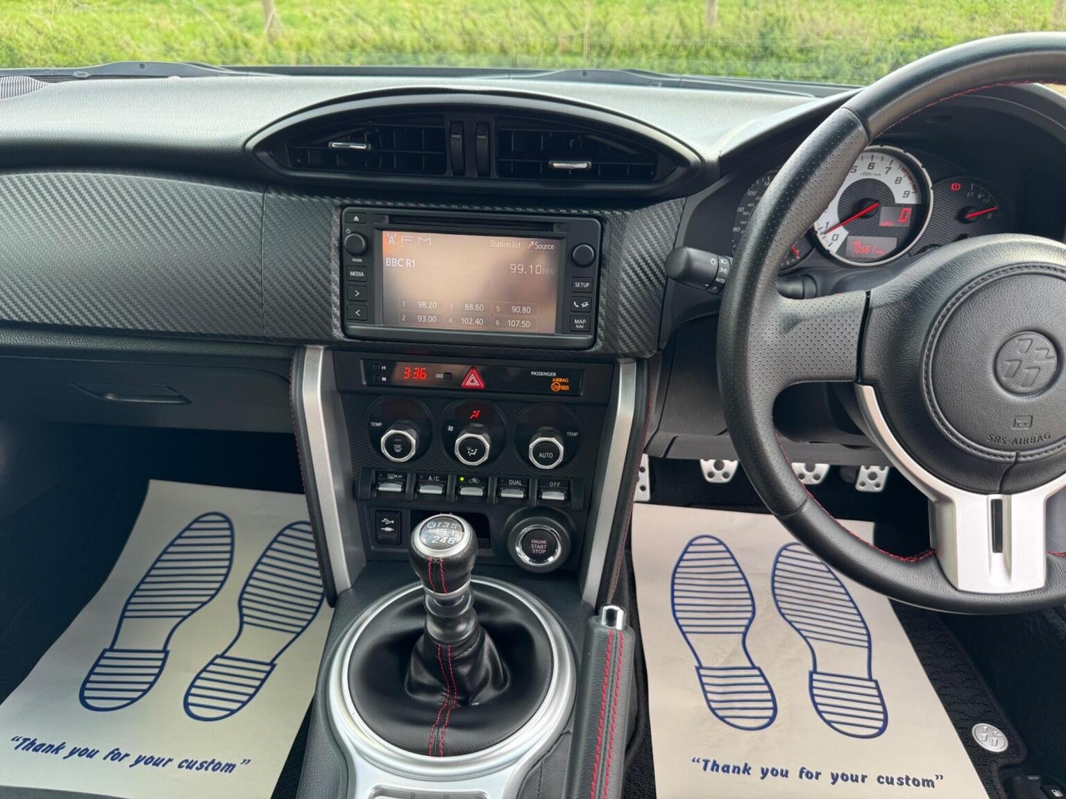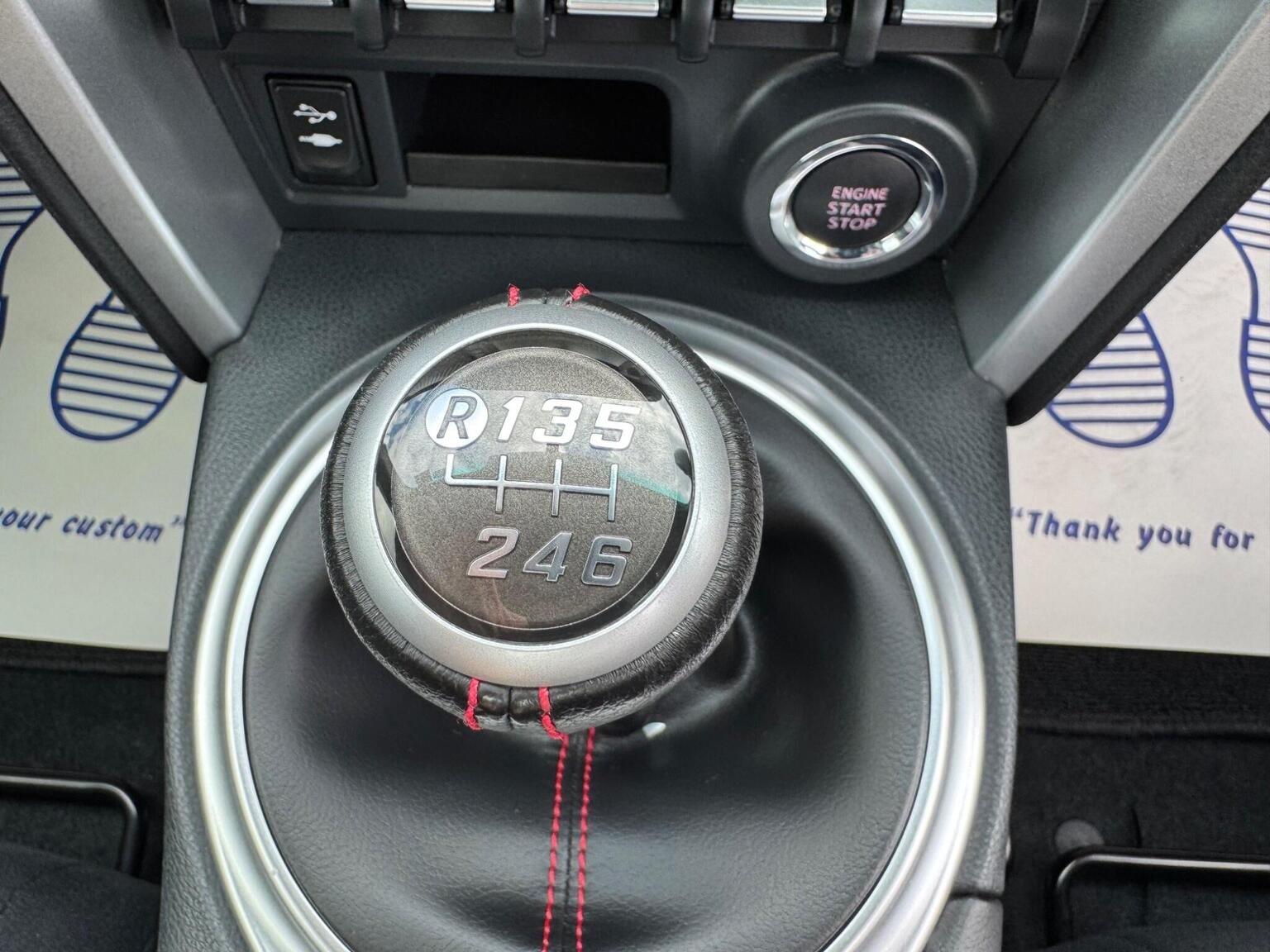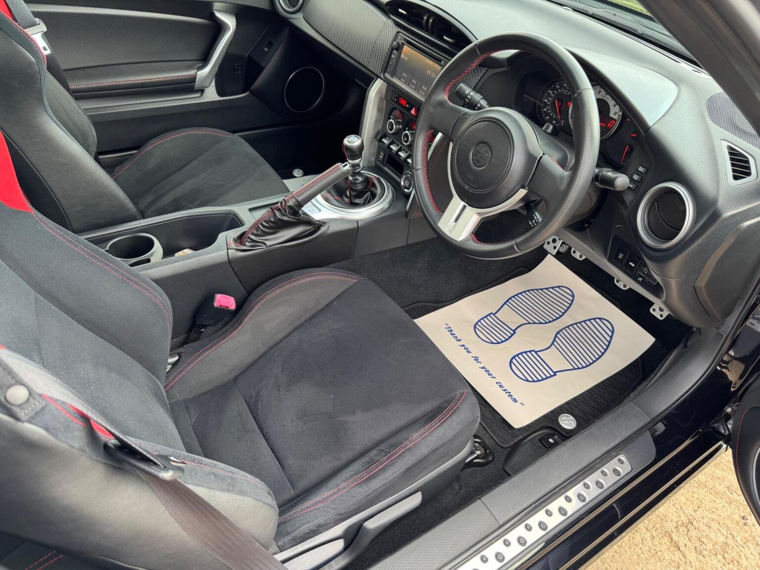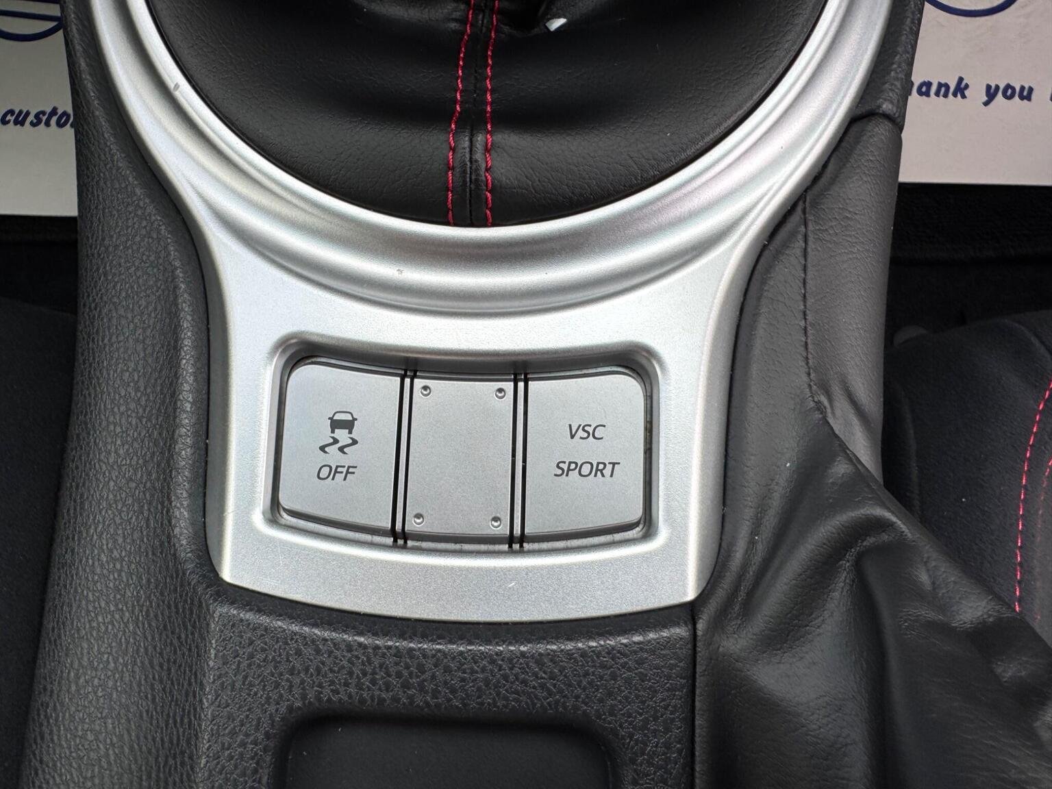 17in Alloy Wheels - 10 Spoke, 3-Spoke Leather Steering Wheel, ABS - Anti Lock Braking System, Airbags - Curtain, Airbags - Driver, Airbags - Driver Knee SRS, Airbags - Front Passenger, Airbags - Front Passenger Cut-Off Switch, Airbags - Front Side, Aluminium Sports Pedals, Aux Input, Aux-USB Connectivity for MP3 and iPod Connectivity, BAS - Brake Assist System, Bluetooth Connectivity, Bluetooth Music Streaming, Bumpers - Body Coloured, Cruise Control, Daytime Running Lights - LED, Door Courtesy Light, Door Handles - Body Coloured, Door Mirrors - Body Colour, Door Mirrors - Electrically Heated and Retractable, Double Wishbone Suspension - Rear, Dual Exhaust Pipe with Chrome Finish, Dual Zone Climate Control, Dusk Sensor, EBD - Electronic Brakeforce Distribution, Electric Power Steering - EPS, Floor Mats with GT86 Logo, Front Fog Lights, Front Map Lights, Front Power Windows, Front Wipers - Twin Speed and Fixed Intermittent, Headlight - Levelling Adjustment, Headlight Washers - Electrically Operated, Headlights - High Intensity Discharge, Illuminated Entry System, Keyless Entry System with Push Button Start, LSD - Limited Slip Differential, Leather Handbrake Lever, MacPherson Strut Front Suspension, Mud Flaps - Front and Rear, Pollen Filter, Push Button Start, Radio and CD Player, Remote Boot Release, Scuff Plates, Seats - Anti-Whiplash Design, Seats - Front Sport, Shark Fin Antenna, Side Impact Beams, Speakers x6, Steering Column - Tilt and Telescopic, Steering Column Lock, Sunvisor - Driver and Passenger with Cover and Light, TPMS - Tyre Pressure Monitoring System, Thatcham Category 1 Alarm System, Touch Screen - 6.1in, Toyota Touch Audio System, Traction Control - TRC, Transponder Key Engine Immobiliser, Trip Computer, Tyre Repair Kit, VSC - Vehicle Stability Control, Vanity Mirrors - Driver and Front Passenger with Cover